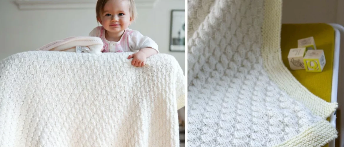 The stitch used for this blanket has the appearance of complicated waves, but it’s just an easy ribbing that starts one stitch to the right every few rows. For an unusual touch, the edging is worked along the sides but doesn’t meet in the corners.