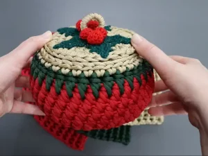 Row 55: with pink thread, knit each loop from the working needle together with loops from an additional needle.
