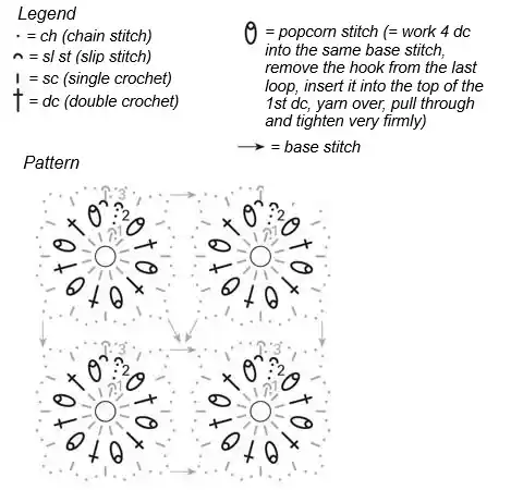 Starting from the 2nd square, join motifs in the positions indicated by the arrows using sl sts.