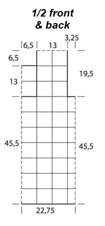 With crochet hook no. 8, make 126 floral squares. Starting from the 2nd square, join them together according to the layout, forming the shape of the top and joining the shoulder seams in the same manner.