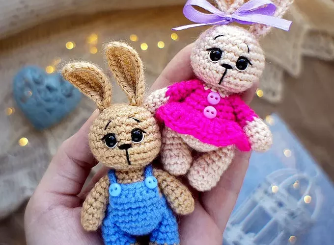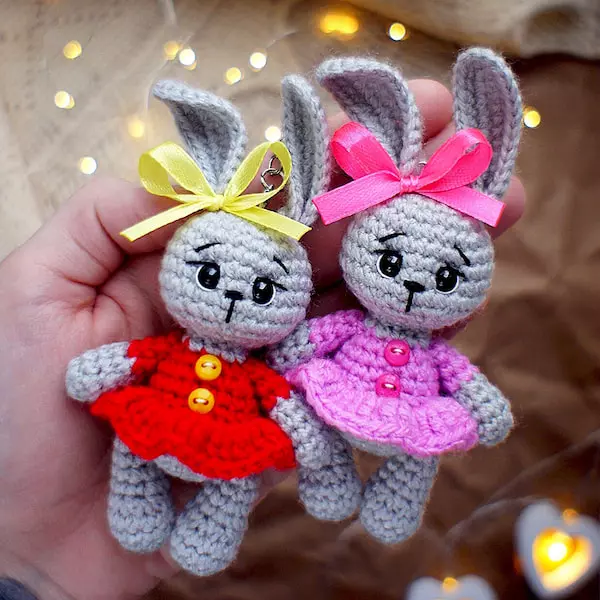 You can make a bunny girl in a dress or a bunny boy with shorts — or create a simple solid-color amigurumi keychain.