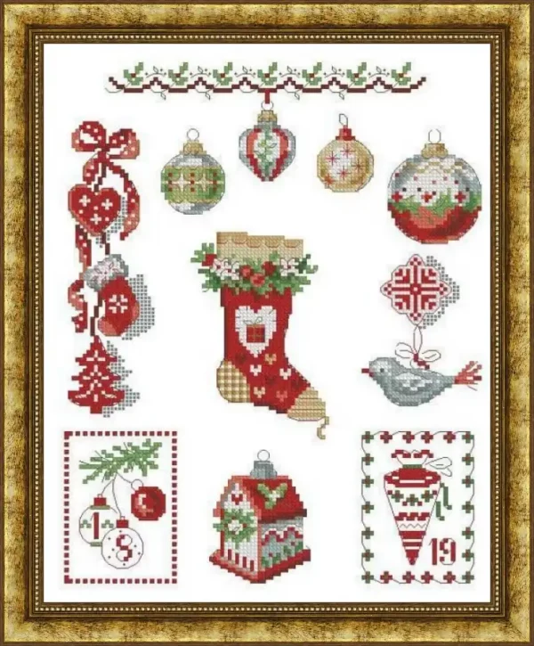 Bring festive spirit to your stitching with this Christmas Ornaments Collection cross stitch pattern — a joyful set featuring classic holiday motifs: stockings, baubles, hearts, mittens, birds, and lanterns.