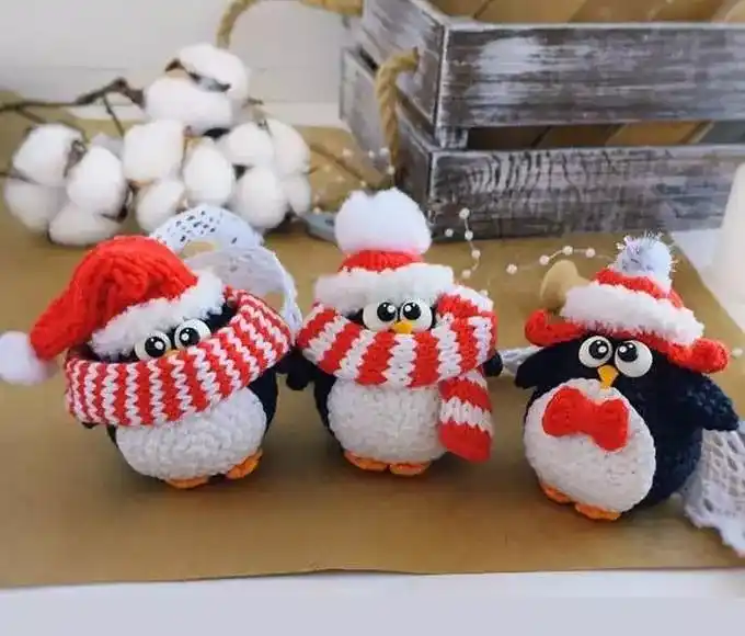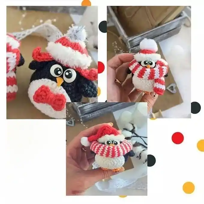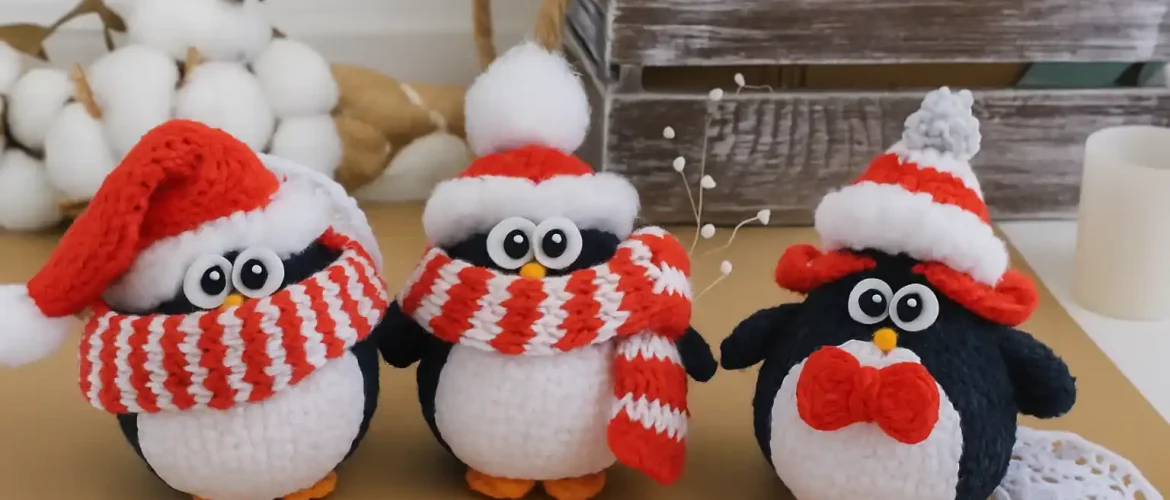 Using this pattern, you can crochet an adorable Christmas penguin. The toy is worked in crochet, while the hat and scarf are knitted. Any semi-cotton yarn suitable for amigurumi, along with the right hook and knitting needles, will work well.