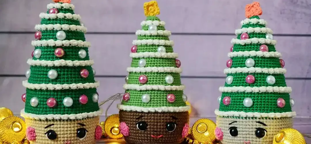 This pattern guides you through crocheting a cute little Christmas tree amigurumi with a charming face. You can use any acrylic, cotton, or cotton-blend yarn and a matching hook. Embellish the toy with colorful half-beads, rhinestones, or pearls. The face is embroidered, and the eyes are made using half-beads.