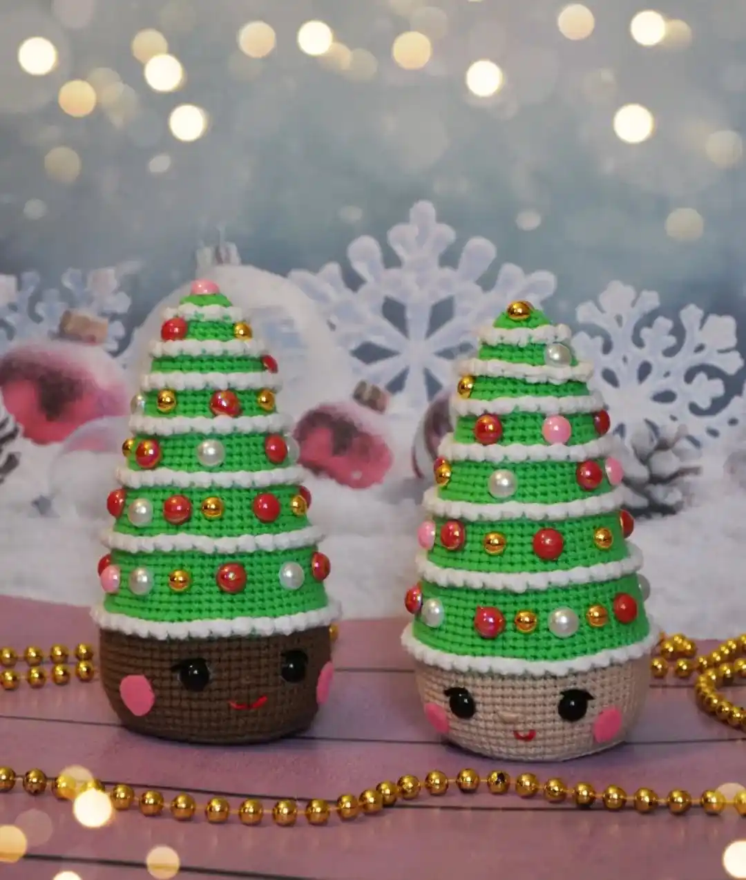 This pattern guides you through crocheting a cute little Christmas tree amigurumi with a charming face. You can use any acrylic, cotton, or cotton-blend yarn and a matching hook. Embellish the toy with colorful half-beads, rhinestones, or pearls. The face is embroidered, and the eyes are made using half-beads.