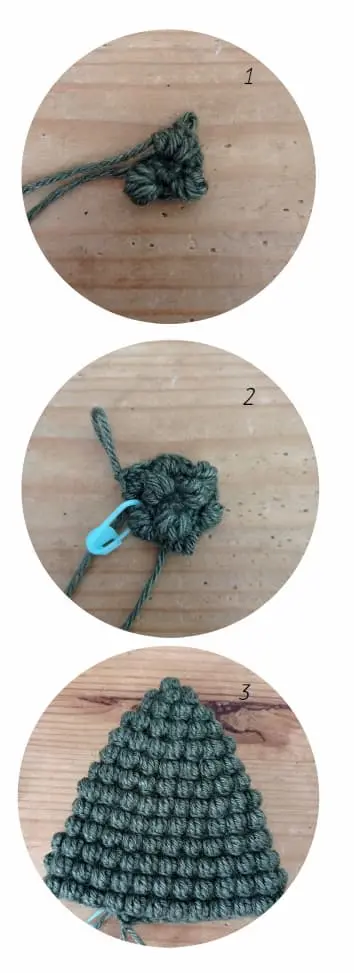 Round 2: (1 sc, in next stitch: bobble + sc) × 3 (9)