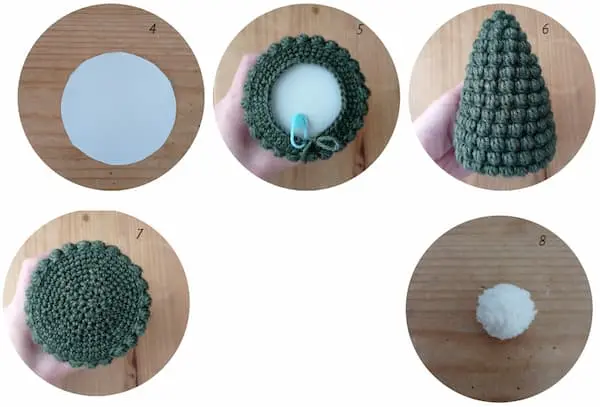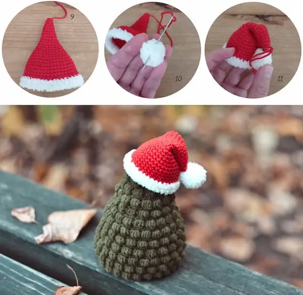 Then fold the tip of the hat as shown in the photo, position the hat on the tree, and if you like the look, sew the tip in place.