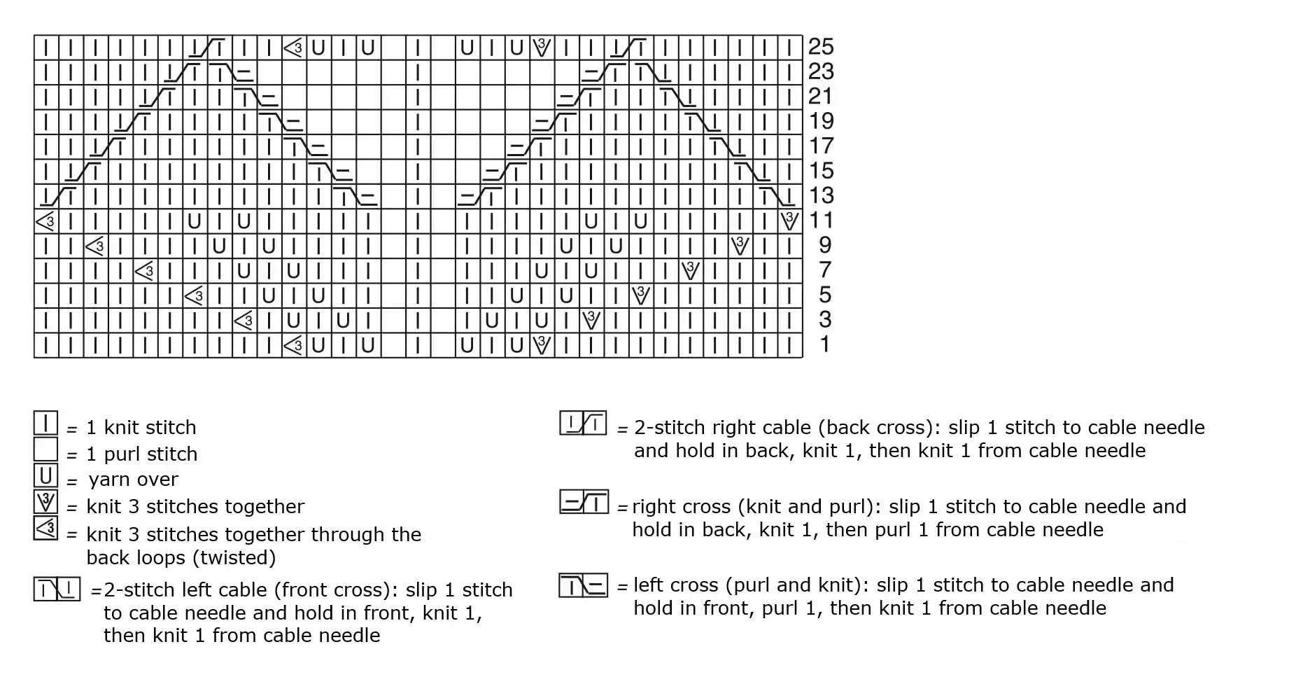 Follow the provided chart. Only right side rows are shown; on wrong side rows, knit the stitches as they appear, purl the yarn overs.