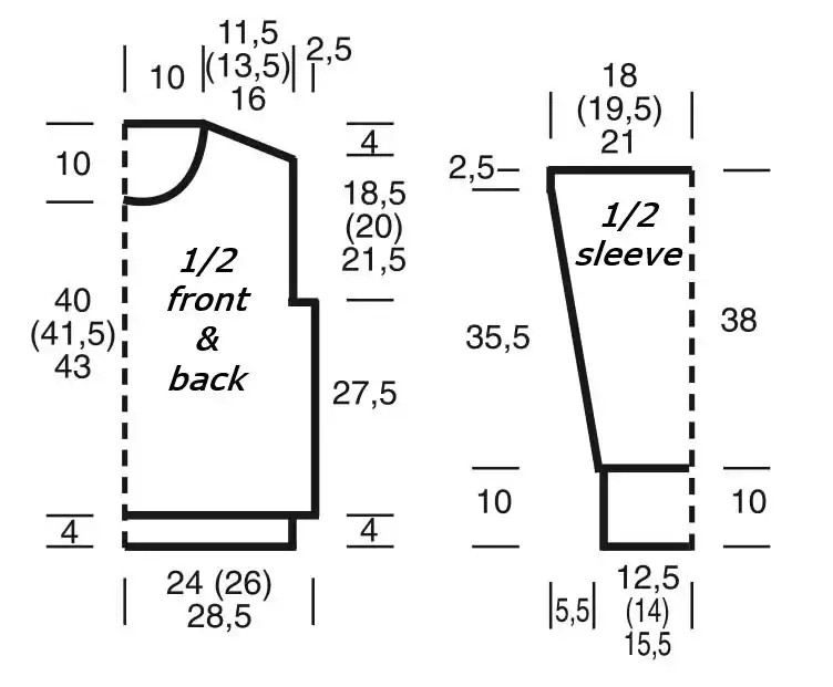 After 46 cm (120 rows) [47.5 cm (124 rows)] 49 cm (128 rows) from the ribbing, bind off 4 stitches on each side, then in every 2nd row bind off 4 (5) 6 stitches 4 times for shoulder shaping.