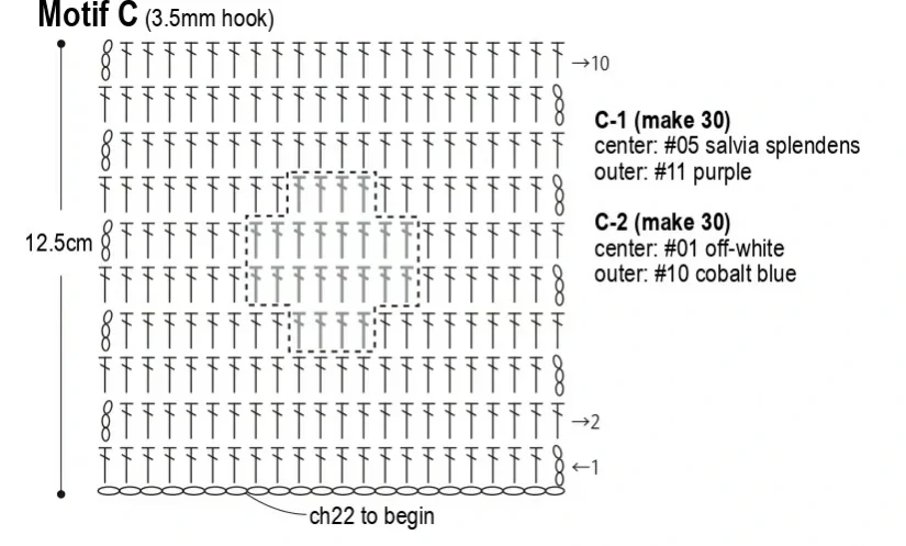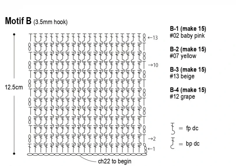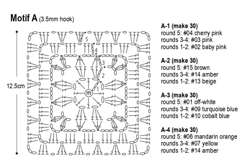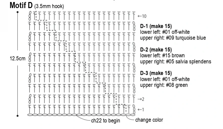 Crochet motifs A, B, C, and D following the diagrams (the number of motifs is indicated to the right of each diagram), changing colors.