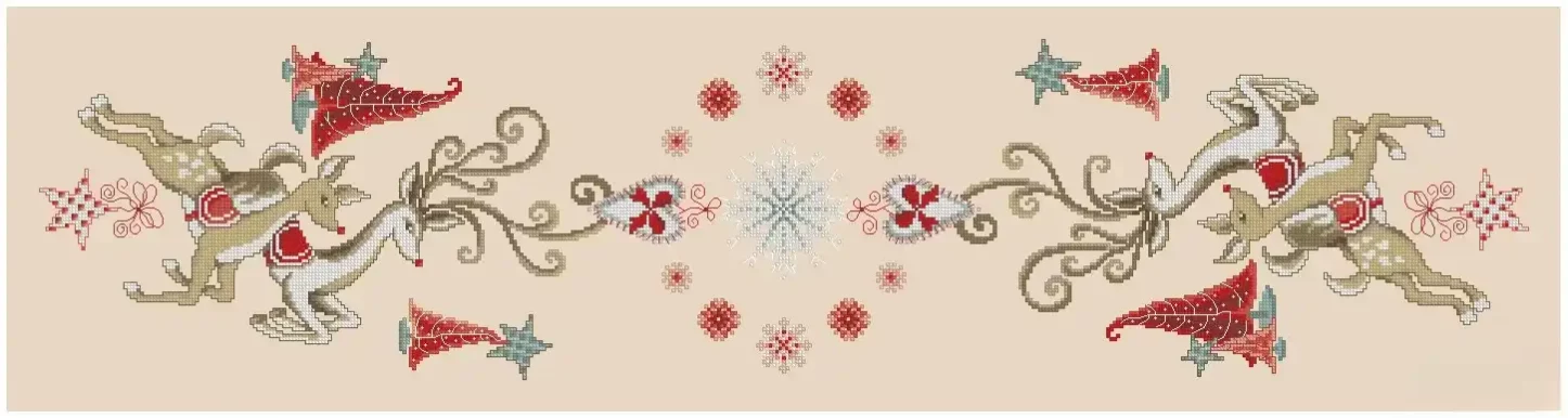 Inspired by traditional Scandinavian winter decor, Nordic Winter Reindeer is a refined cross stitch pattern that captures the spirit of Nordic folklore through elegant ornamentation. Leaping reindeer, swirling folk details, snowflake accents, and decorative elements form a long horizontal design with a calm, festive rhythm.