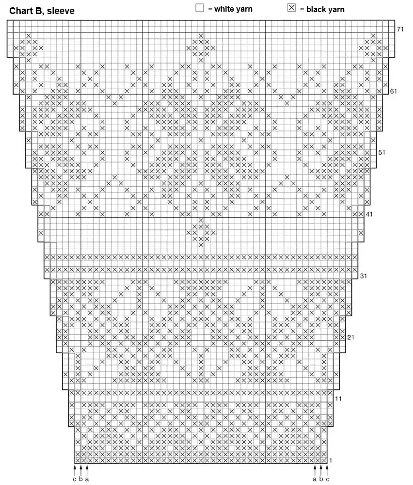 When knitting larger areas of the same color, twist the yarns together from time to time on the wrong side to prevent long floats and ensure even tension.Arrows and vertical guide lines on the charts indicate stitches for each specific size: