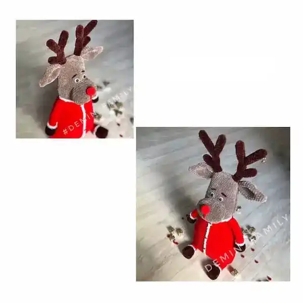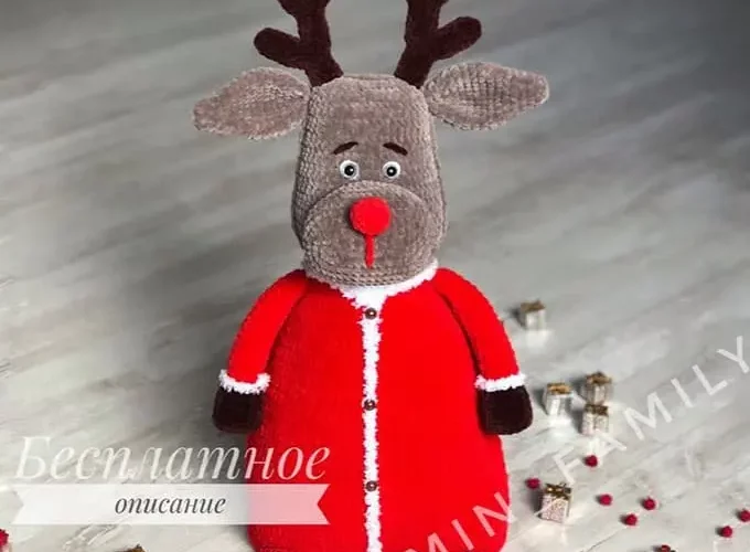 Using this pattern you can crochet a plush deer pillow. You’ll work with chenille yarns YarnArt Dolce and Himalaya Dolphin Baby, plus YarnArt Happy for the trim on the clothes. The clothes are non-removable (crocheted as part of the body). Add buttons for decoration. No wire is used. The nose is crocheted, and the eyes are plastic safety eyes.