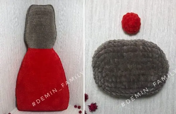 - Round 18: Join Piece 1: on the 2+3 piece work 5 sc; on Piece 1 work (2 sc, dec) × 2; back on the main piece (2 sc, dec) × 2. Place a marker. Sew any small gaps between pieces (12).
