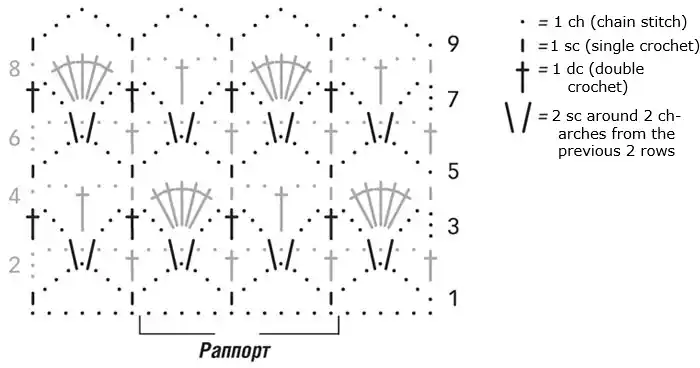Crochet according to the chart. Begin each row with 1 or 3 ch for turning, replacing the first sc or dc respectively. Start with the stitches before the repeat, work the repeat continuously, and finish with the stitches after the repeat.