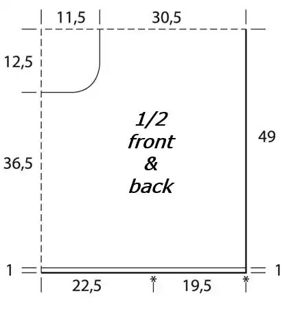 Sew the bottom and sleeve seams along 19.5 cm on both sides (as marked * to * on the schematic). Join the beginning and end of the ribbing strip. Sew the right long edge of the ribbing to the bottom of the pullover.