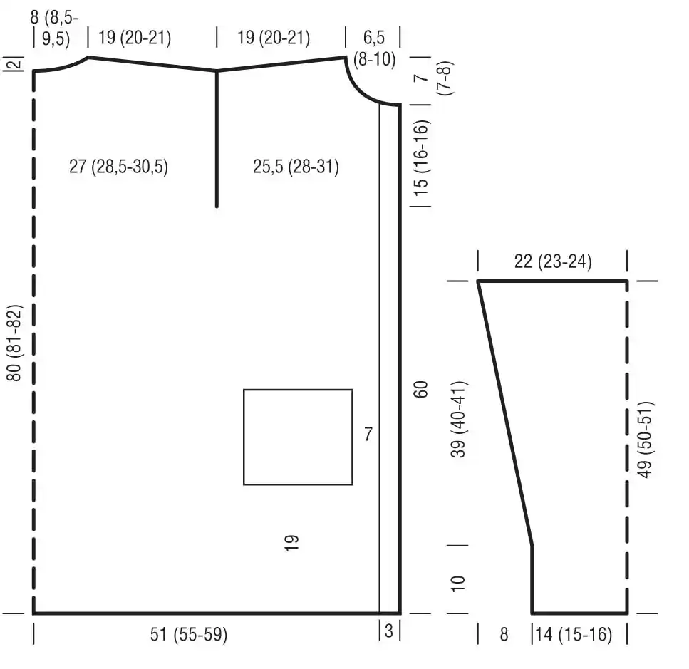 After 20 (21) 22 cm = 56 (58) 60 rows, bind off 7 sts at each edge for shoulder shaping. Then bind off 7 sts twice more (or 7 and 8 / or 8 twice), depending on size.