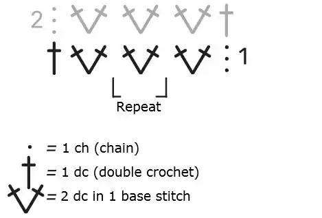 When working back and forth, begin each row with 3 turning chains instead of the first double crochet and the stitches before the repeat; repeat the pattern multiple times, then finish with the stitches after the repeat. Repeat Rows 1 and 2 throughout.
