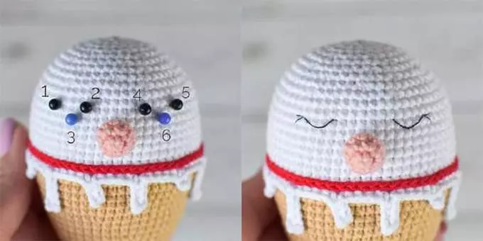 Mark the eyes with pins. Points 1 and 4 are between rounds 29 and 30, points 2–3 and 5–6 are between rounds 28 and 29. Eye width: 3 sc, height: 1 sc, distance between eyes: 5 sc.