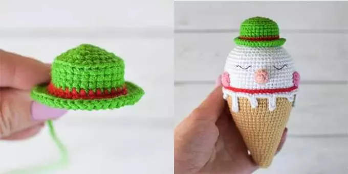 Cut the yarn leaving a long tail. Sew the hat to the top of the ice cream, stuffing it lightly as you go (do not overstuff).