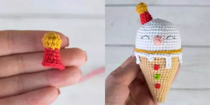 Stuff the cherry, tighten the opening and hide the yarn tail. Sew or glue the cherry to the top of the ice cream so it tilts slightly to the side (I glue it).