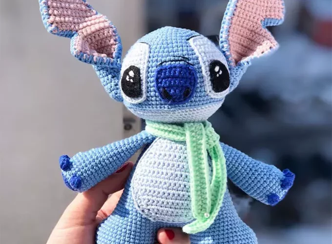 According to this description, you can crochet Stitch with a scarf using a crochet technique from the animated film “Lilo & Stitch.” Any cotton yarn is suitable for crocheting amigurumi: YarnArt Jeans, Alize Cotton Gold, Gazzal Baby Cotton, and others. Stitch’s eyes are made from black felt, the spots on the eyes and the nose are crocheted. Finer details on the muzzle (eyebrows and lines above the nose) are embroidered with thin mouline thread.