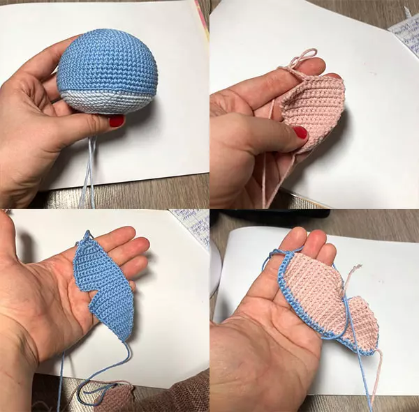 After crocheting all the pieces, take the blue piece and start joining it with the pink one. Just edge around in a circle. Join the left pieces together and the right pieces together. When edging, fold the ears in half, as shown in the last photo, and edge together with approximately 5-6 sc.