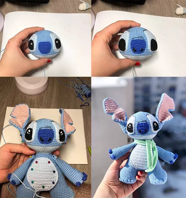 According to this description, you can crochet Stitch with a scarf using a crochet technique from the animated film “Lilo & Stitch.” Any cotton yarn is suitable for crocheting amigurumi: YarnArt Jeans, Alize Cotton Gold, Gazzal Baby Cotton, and others. Stitch’s eyes are made from black felt, the spots on the eyes and the nose are crocheted. Finer details on the muzzle (eyebrows and lines above the nose) are embroidered with thin mouline thread.