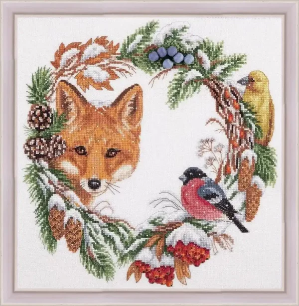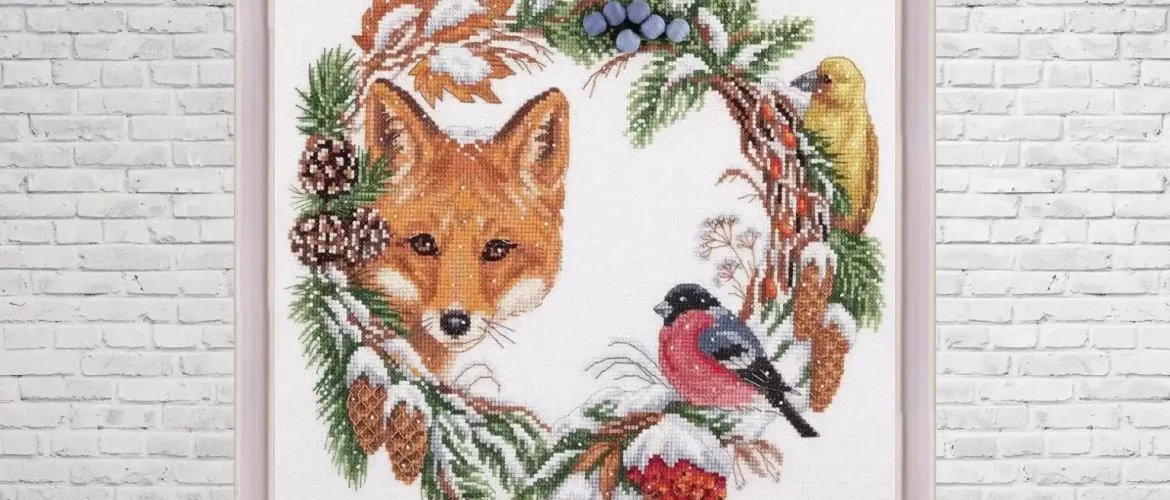 Bring the charm of the forest into your home with this captivating Winter Woodland Wreath cross stitch pattern — a heartwarming circular composition featuring a graceful fox surrounded by pine cones, rowan berries, and cheerful birds.