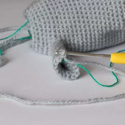 Rnd 14: 3 sc, count 3 stitches back from the hook and crochet a sc into the 4th stitch, sl st – this forms the big thumb. Tighten the loop, hide the yarn.