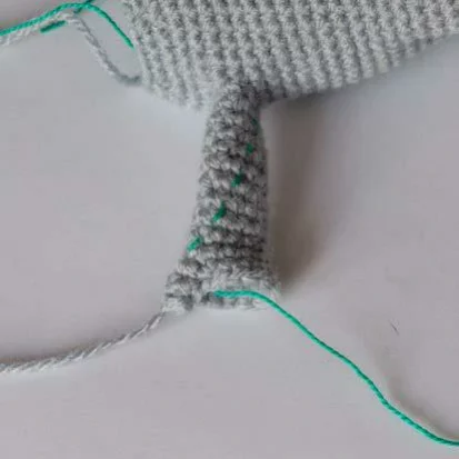 Rnd 15: Attach the yarn at the finger on the inner side of the hand. 10 sc (10)
